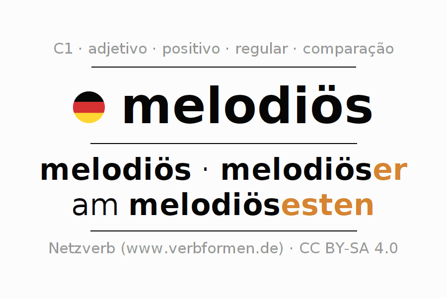 A declinação do adjetivo melodiös (harmonioso, melódico) utiliza as seguintes formas de comparação melodiös,melodiöser,am melodiösesten. As terminações para o comparativo e o superlativo são er/esten. O adjectivo melodiös pode ser utilizado tanto como atributivo antes de um substantivo ou como predicativo junto com um verbo.Não se pode flexionar e comparar somente o adjetivo melodiös, mas sim todos os adjetivos em alemão. Comentários ☆