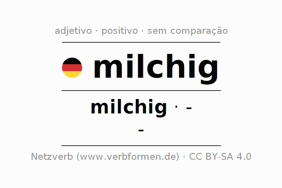 A declinação do adjetivo milchig não forma o grau de comparação milchig. O adjectivo não tem forma no comparativo e nem no superlativo. O adjectivo milchig pode ser utilizado tanto como atributivo antes de um substantivo ou como predicativo junto com um verbo.Não se pode flexionar e comparar somente o adjetivo milchig, mas sim todos os adjetivos em alemão. Comentários ☆