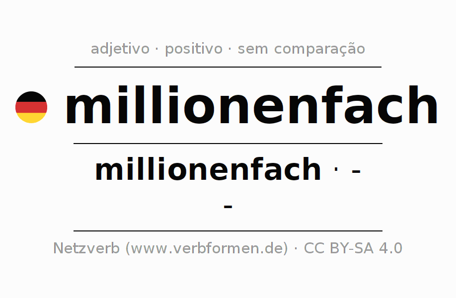 A declinação do adjetivo millionenfach não forma o grau de comparação millionenfach. O adjectivo não tem forma no comparativo e nem no superlativo. O adjectivo millionenfach pode ser utilizado tanto como atributivo antes de um substantivo ou como predicativo junto com um verbo.Não se pode flexionar e comparar somente o adjetivo millionenfach, mas sim todos os adjetivos em alemão. Comentários ☆