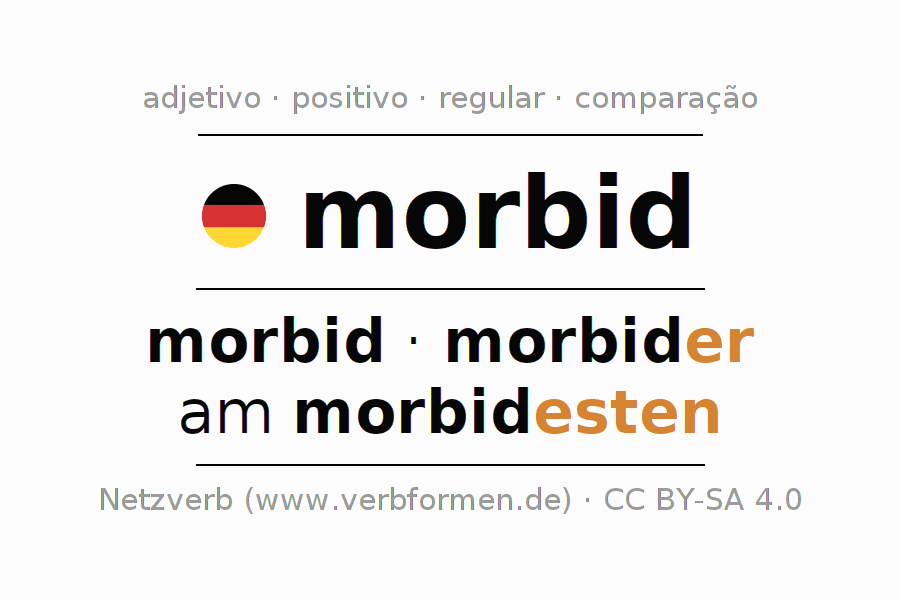 A declinação do adjetivo morbid (mórbido, doentio) utiliza as seguintes formas de comparação morbid,morbider,am morbidesten. As terminações para o comparativo e o superlativo são er/esten. O adjectivo morbid pode ser utilizado tanto como atributivo antes de um substantivo ou como predicativo junto com um verbo.Não se pode flexionar e comparar somente o adjetivo morbid, mas sim todos os adjetivos em alemão. Comentários ☆
