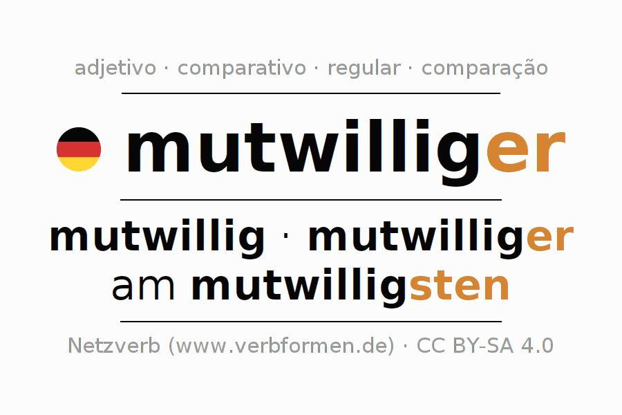 A declinação do adjetivo mutwilliger (intencional, malicioso) utiliza as seguintes formas de comparação mutwillig,mutwilliger,am mutwilligsten. As terminações para o comparativo e o superlativo são er/sten. O adjectivo mutwilliger pode ser utilizado tanto como atributivo antes de um substantivo ou como predicativo junto com um verbo.Não se pode flexionar e comparar somente o adjetivo mutwilliger, mas sim todos os adjetivos em alemão. Comentários ☆