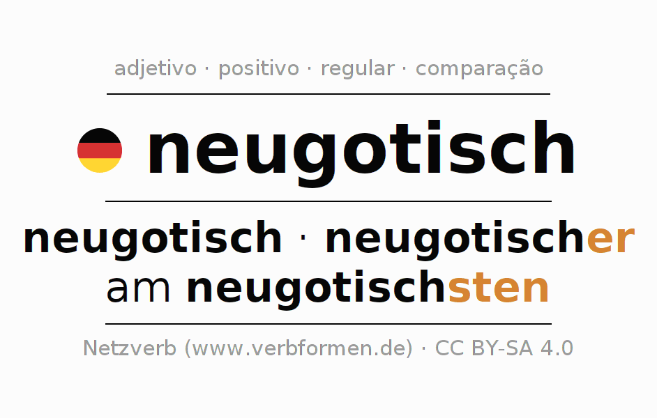 A declinação do adjetivo neugotisch (neogótico) utiliza as seguintes formas de comparação neugotisch,neugotischer,am neugotischsten. As terminações para o comparativo e o superlativo são er/sten. O adjectivo neugotisch pode ser utilizado tanto como atributivo antes de um substantivo ou como predicativo junto com um verbo.Não se pode flexionar e comparar somente o adjetivo neugotisch, mas sim todos os adjetivos em alemão. Comentários ☆