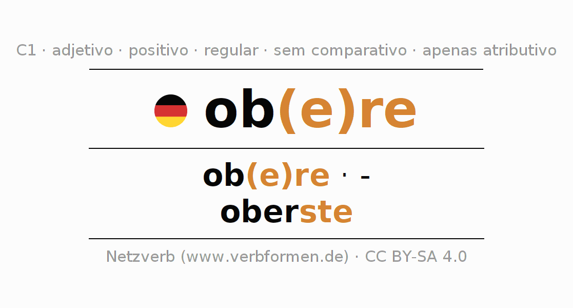 A declinação do adjetivo obere (acima, superior) utiliza as seguintes formas de comparação obere,-,oberste. As terminações para o comparativo e o superlativo são -/ste. O adjectivo obere somente pode ser utilizado como atributivo antes de um substantivo mas não como predicativo junto de um verbo.Não se pode flexionar e comparar somente o adjetivo obere, mas sim todos os adjetivos em alemão. Comentários ☆