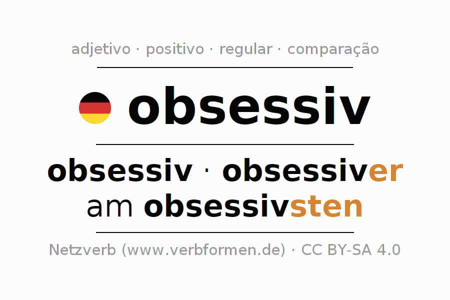 A declinação do adjetivo obsessiv (obsessivo) utiliza as seguintes formas de comparação obsessiv,obsessiver,am obsessivsten. As terminações para o comparativo e o superlativo são er/sten. O adjectivo obsessiv pode ser utilizado tanto como atributivo antes de um substantivo ou como predicativo junto com um verbo.Não se pode flexionar e comparar somente o adjetivo obsessiv, mas sim todos os adjetivos em alemão. Comentários ☆