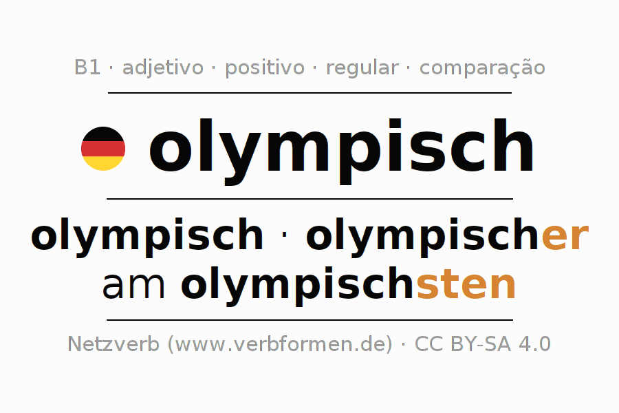 A declinação do adjetivo olympisch (olímpico) utiliza as seguintes formas de comparação olympisch,olympischer,am olympischsten. As terminações para o comparativo e o superlativo são er/sten. O adjectivo olympisch pode ser utilizado tanto como atributivo antes de um substantivo ou como predicativo junto com um verbo.Não se pode flexionar e comparar somente o adjetivo olympisch, mas sim todos os adjetivos em alemão. Comentários ☆