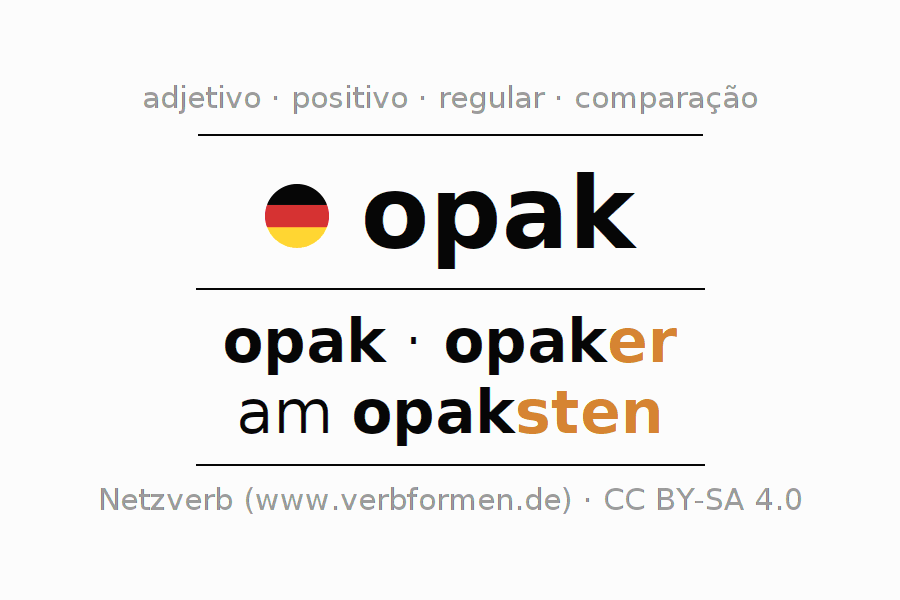 A declinação do adjetivo opak (opaco, confuso) utiliza as seguintes formas de comparação opak,opaker,am opaksten. As terminações para o comparativo e o superlativo são er/sten. O adjectivo opak pode ser utilizado tanto como atributivo antes de um substantivo ou como predicativo junto com um verbo.Não se pode flexionar e comparar somente o adjetivo opak, mas sim todos os adjetivos em alemão. Comentários ☆