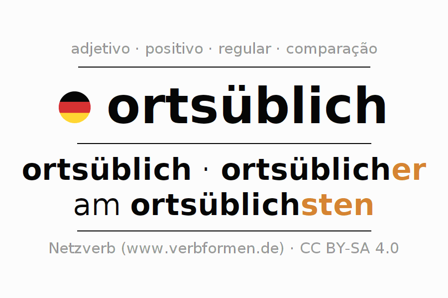 A declinação do adjetivo ortsüblich (habitual, local) utiliza as seguintes formas de comparação ortsüblich,ortsüblicher,am ortsüblichsten. As terminações para o comparativo e o superlativo são er/sten. O adjectivo ortsüblich pode ser utilizado tanto como atributivo antes de um substantivo ou como predicativo junto com um verbo.Não se pode flexionar e comparar somente o adjetivo ortsüblich, mas sim todos os adjetivos em alemão. Comentários ☆