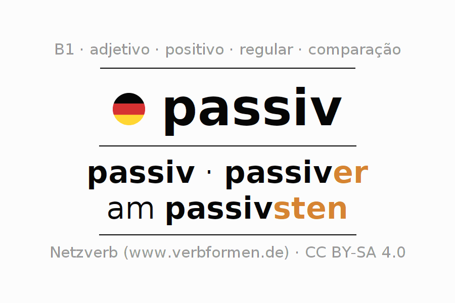 A declinação do adjetivo passiv (passivo, submisso) utiliza as seguintes formas de comparação passiv,passiver,am passivsten. As terminações para o comparativo e o superlativo são er/sten. O adjectivo passiv pode ser utilizado tanto como atributivo antes de um substantivo ou como predicativo junto com um verbo.Não se pode flexionar e comparar somente o adjetivo passiv, mas sim todos os adjetivos em alemão. Comentários ☆