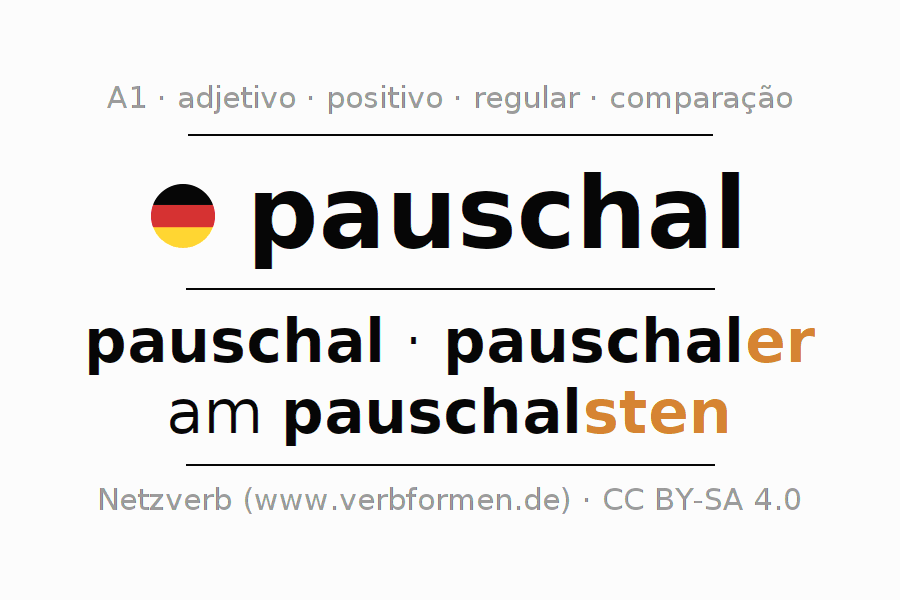 A declinação do adjetivo pauschal (geral, global) utiliza as seguintes formas de comparação pauschal,pauschaler,am pauschalsten. As terminações para o comparativo e o superlativo são er/sten. O adjectivo pauschal pode ser utilizado tanto como atributivo antes de um substantivo ou como predicativo junto com um verbo.Não se pode flexionar e comparar somente o adjetivo pauschal, mas sim todos os adjetivos em alemão. Comentários ☆