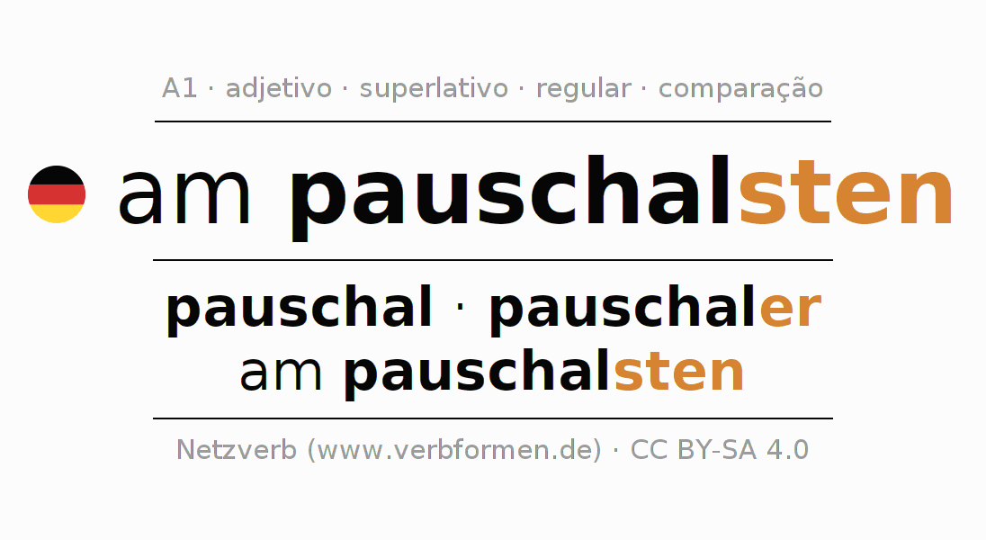 A declinação do adjetivo am pauschalsten (geral, global) utiliza as seguintes formas de comparação pauschal,pauschaler,am pauschalsten. As terminações para o comparativo e o superlativo são er/sten. O adjectivo am pauschalsten pode ser utilizado tanto como atributivo antes de um substantivo ou como predicativo junto com um verbo.Não se pode flexionar e comparar somente o adjetivo am pauschalsten, mas sim todos os adjetivos em alemão. Comentários ☆