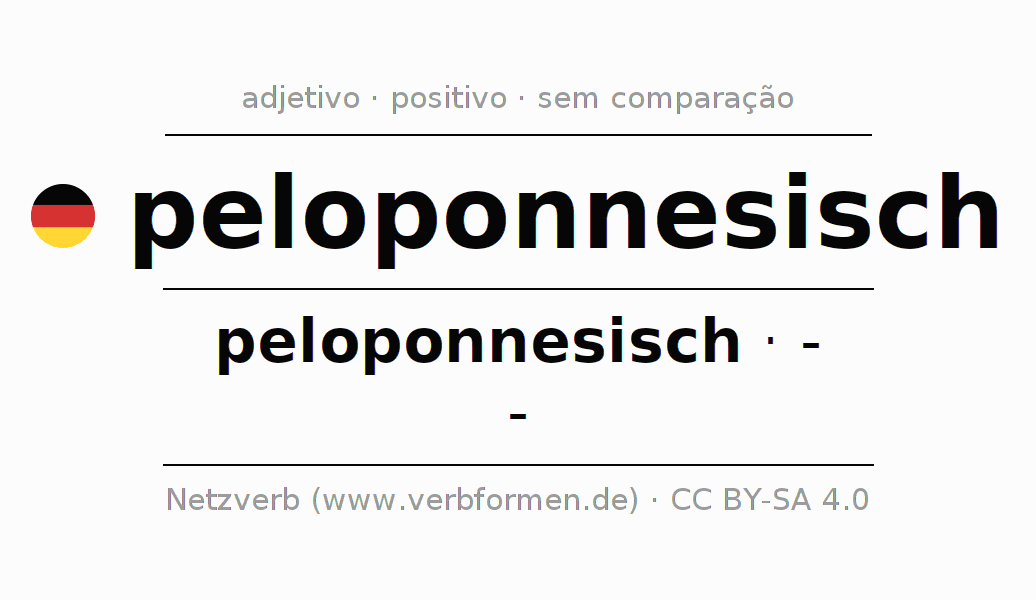 A declinação do adjetivo peloponnesisch não forma o grau de comparação peloponnesisch. O adjectivo não tem forma no comparativo e nem no superlativo. O adjectivo peloponnesisch pode ser utilizado tanto como atributivo antes de um substantivo ou como predicativo junto com um verbo.Não se pode flexionar e comparar somente o adjetivo peloponnesisch, mas sim todos os adjetivos em alemão. Comentários ☆