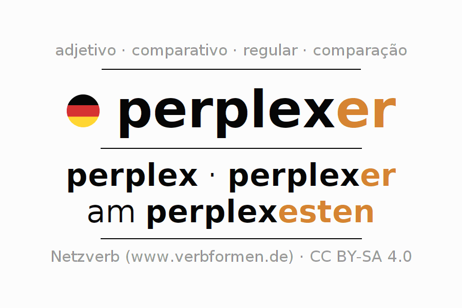 A declinação e o comparativo de perplexer são apresentados online em tabelas em todas as formas: forte, fraca e mista. Assim como no singular e no plural. Também são apresentados os 4 casos: nominativo (auch 1. Fall, Wer-Fall), genitivo (auch 2. Fall, Wes-Fall, Wessen-Fall), dativo (auch3. Fall, Wem-Fall) e acusativo (auch4. Fall, Wen-Fall). Mais informações podem ser encontradas em Wiktionary perplexer e perplexer no Duden.