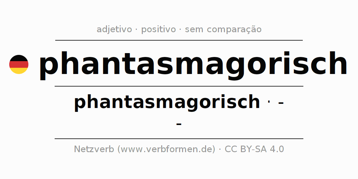 A declinação do adjetivo phantasmagorisch não forma o grau de comparação phantasmagorisch. O adjectivo não tem forma no comparativo e nem no superlativo. O adjectivo phantasmagorisch pode ser utilizado tanto como atributivo antes de um substantivo ou como predicativo junto com um verbo.Não se pode flexionar e comparar somente o adjetivo phantasmagorisch, mas sim todos os adjetivos em alemão. Comentários ☆