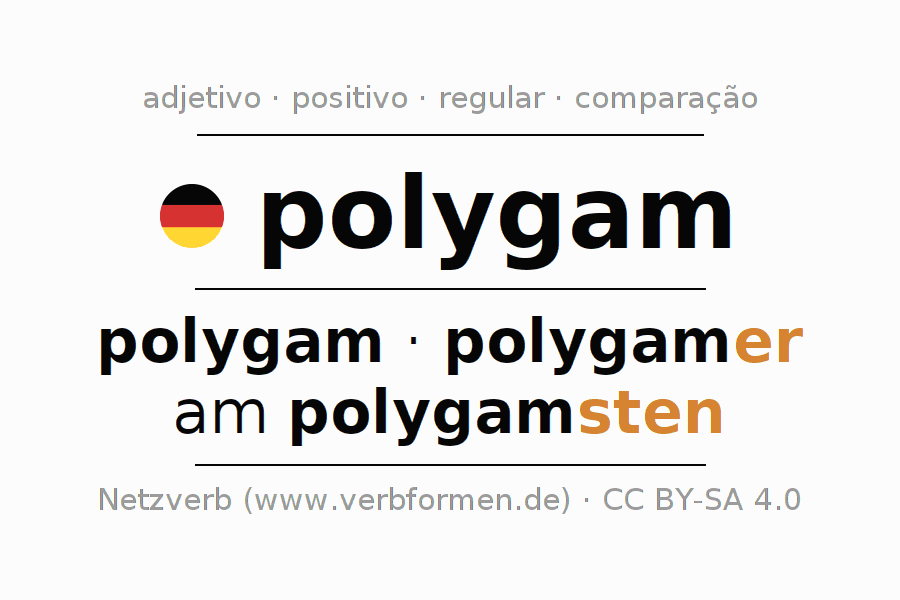 A declinação do adjetivo polygam (poligâmico) utiliza as seguintes formas de comparação polygam,polygamer,am polygamsten. As terminações para o comparativo e o superlativo são er/sten. O adjectivo polygam pode ser utilizado tanto como atributivo antes de um substantivo ou como predicativo junto com um verbo.Não se pode flexionar e comparar somente o adjetivo polygam, mas sim todos os adjetivos em alemão. Comentários ☆