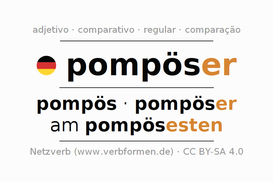 A declinação do adjetivo pompöser (esplêndido, pomposo) utiliza as seguintes formas de comparação pompös,pompöser,am pompösesten. As terminações para o comparativo e o superlativo são er/esten. O adjectivo pompöser pode ser utilizado tanto como atributivo antes de um substantivo ou como predicativo junto com um verbo.Não se pode flexionar e comparar somente o adjetivo pompöser, mas sim todos os adjetivos em alemão. Comentários ☆