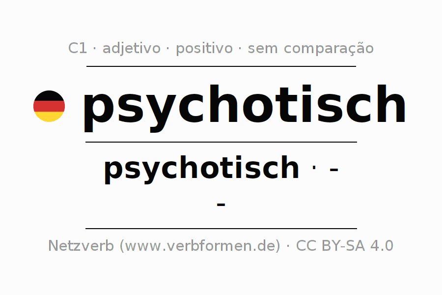 A declinação do adjetivo psychotisch não forma o grau de comparação psychotisch. O adjectivo não tem forma no comparativo e nem no superlativo. O adjectivo psychotisch pode ser utilizado tanto como atributivo antes de um substantivo ou como predicativo junto com um verbo.Não se pode flexionar e comparar somente o adjetivo psychotisch, mas sim todos os adjetivos em alemão. Comentários ☆