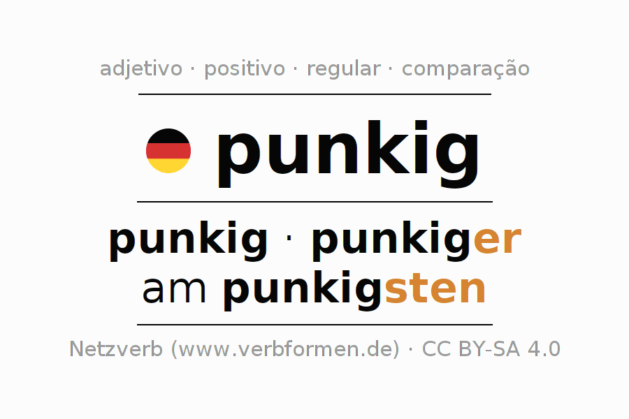 A declinação do adjetivo punkig (não convencional, punk) utiliza as seguintes formas de comparação punkig,punkiger,am punkigsten. As terminações para o comparativo e o superlativo são er/sten. O adjectivo punkig pode ser utilizado tanto como atributivo antes de um substantivo ou como predicativo junto com um verbo.Não se pode flexionar e comparar somente o adjetivo punkig, mas sim todos os adjetivos em alemão. Comentários ☆