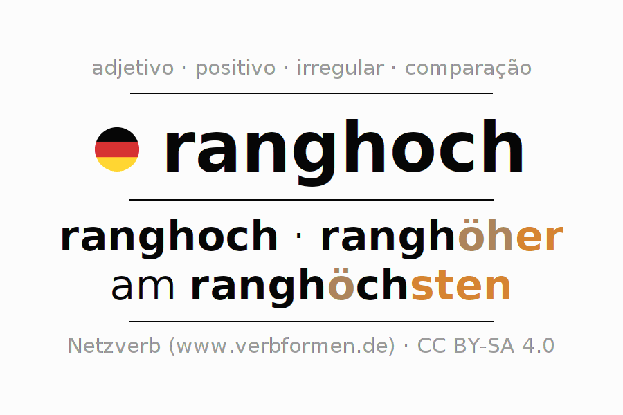A declinação do adjetivo ranghoch (alto, de alto escalão) utiliza as seguintes formas de comparação ranghoch,ranghöher,am ranghöchsten. As terminações para o comparativo e o superlativo são ö-er/ö-sten. O adjectivo ranghoch pode ser utilizado tanto como atributivo antes de um substantivo ou como predicativo junto com um verbo.Não se pode flexionar e comparar somente o adjetivo ranghoch, mas sim todos os adjetivos em alemão. Comentários ☆