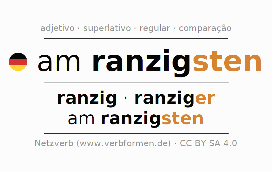 A declinação do adjetivo am ranzigsten (estragado, rançoso) utiliza as seguintes formas de comparação ranzig,ranziger,am ranzigsten. As terminações para o comparativo e o superlativo são er/sten. O adjectivo am ranzigsten pode ser utilizado tanto como atributivo antes de um substantivo ou como predicativo junto com um verbo.Não se pode flexionar e comparar somente o adjetivo am ranzigsten, mas sim todos os adjetivos em alemão. Comentários ☆