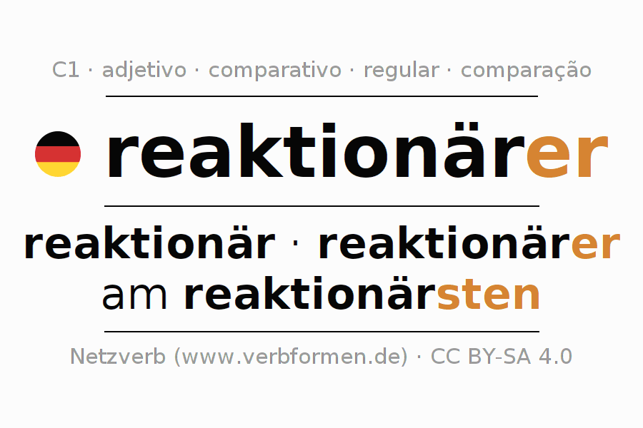 A declinação do adjetivo reaktionärer (reacionário) utiliza as seguintes formas de comparação reaktionär,reaktionärer,am reaktionärsten. As terminações para o comparativo e o superlativo são er/sten. O adjectivo reaktionärer pode ser utilizado tanto como atributivo antes de um substantivo ou como predicativo junto com um verbo.Não se pode flexionar e comparar somente o adjetivo reaktionärer, mas sim todos os adjetivos em alemão. Comentários ☆