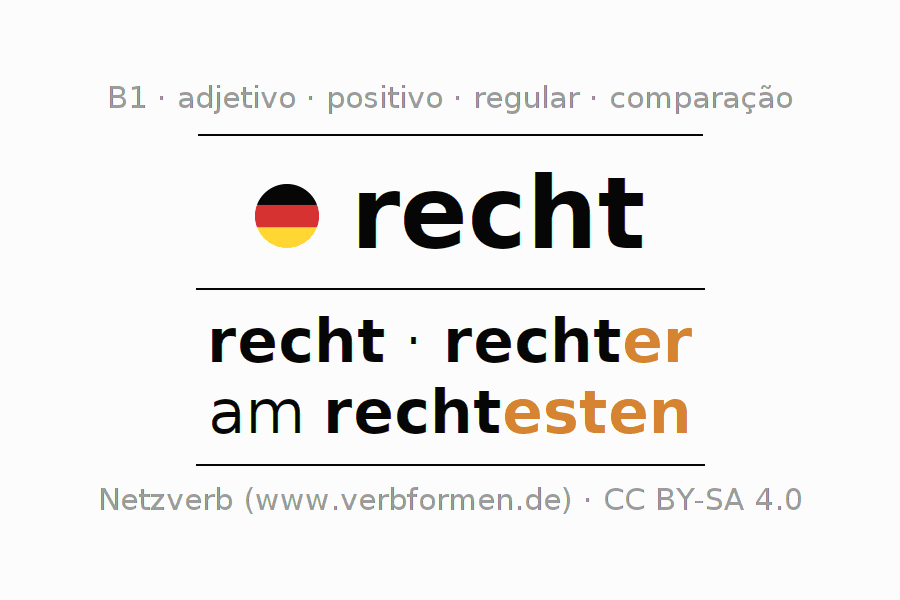 A declinação do adjetivo recht (justo, certo) utiliza as seguintes formas de comparação recht,rechter,am rechtesten. As terminações para o comparativo e o superlativo são er/esten. O adjectivo recht pode ser utilizado tanto como atributivo antes de um substantivo ou como predicativo junto com um verbo.Não se pode flexionar e comparar somente o adjetivo recht, mas sim todos os adjetivos em alemão. Comentários ☆