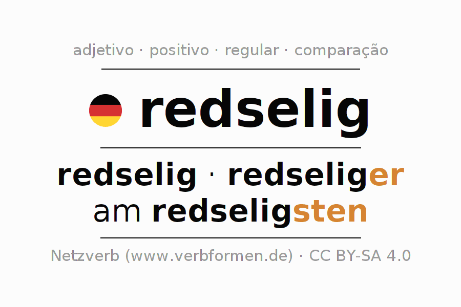 A declinação do adjetivo redselig (falador, comunicativo) utiliza as seguintes formas de comparação redselig,redseliger,am redseligsten. As terminações para o comparativo e o superlativo são er/sten. O adjectivo redselig pode ser utilizado tanto como atributivo antes de um substantivo ou como predicativo junto com um verbo.Não se pode flexionar e comparar somente o adjetivo redselig, mas sim todos os adjetivos em alemão. Comentários ☆