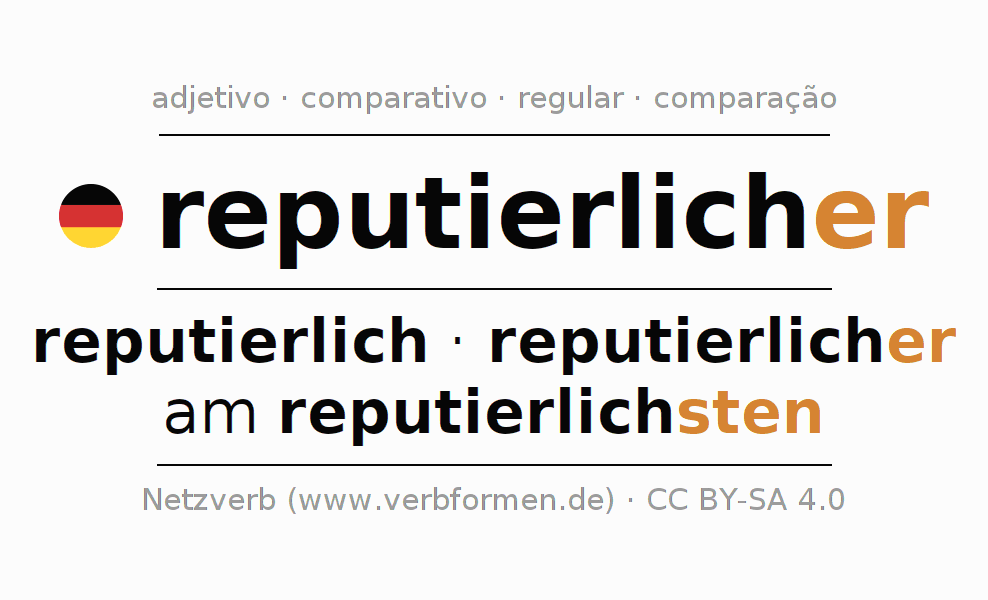 A declinação do adjetivo reputierlicher (reputável, respeitável) utiliza as seguintes formas de comparação reputierlich,reputierlicher,am reputierlichsten. As terminações para o comparativo e o superlativo são er/sten. O adjectivo reputierlicher pode ser utilizado tanto como atributivo antes de um substantivo ou como predicativo junto com um verbo.Não se pode flexionar e comparar somente o adjetivo reputierlicher, mas sim todos os adjetivos em alemão. Comentários ☆