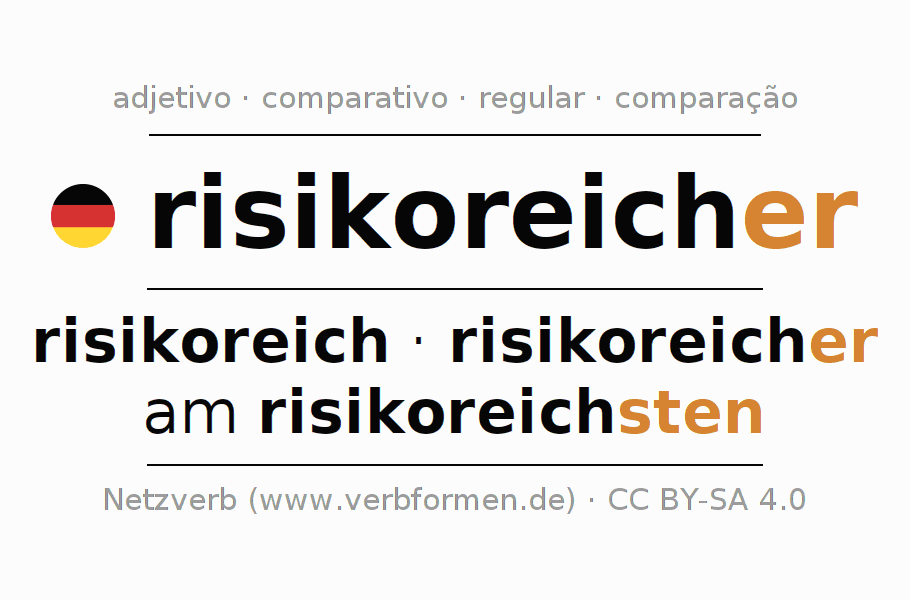 A declinação do adjetivo risikoreicher (arriscado, perigoso) utiliza as seguintes formas de comparação risikoreich,risikoreicher,am risikoreichsten. As terminações para o comparativo e o superlativo são er/sten. O adjectivo risikoreicher pode ser utilizado tanto como atributivo antes de um substantivo ou como predicativo junto com um verbo.Não se pode flexionar e comparar somente o adjetivo risikoreicher, mas sim todos os adjetivos em alemão. Comentários ☆
