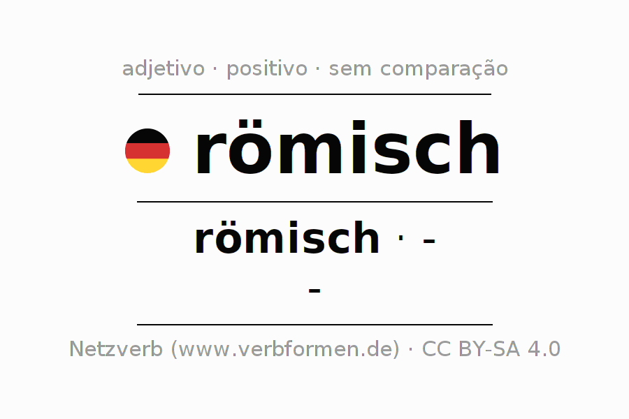 A declinação do adjetivo römisch não forma o grau de comparação römisch. O adjectivo não tem forma no comparativo e nem no superlativo. O adjectivo römisch pode ser utilizado tanto como atributivo antes de um substantivo ou como predicativo junto com um verbo.Não se pode flexionar e comparar somente o adjetivo römisch, mas sim todos os adjetivos em alemão. Comentários ☆