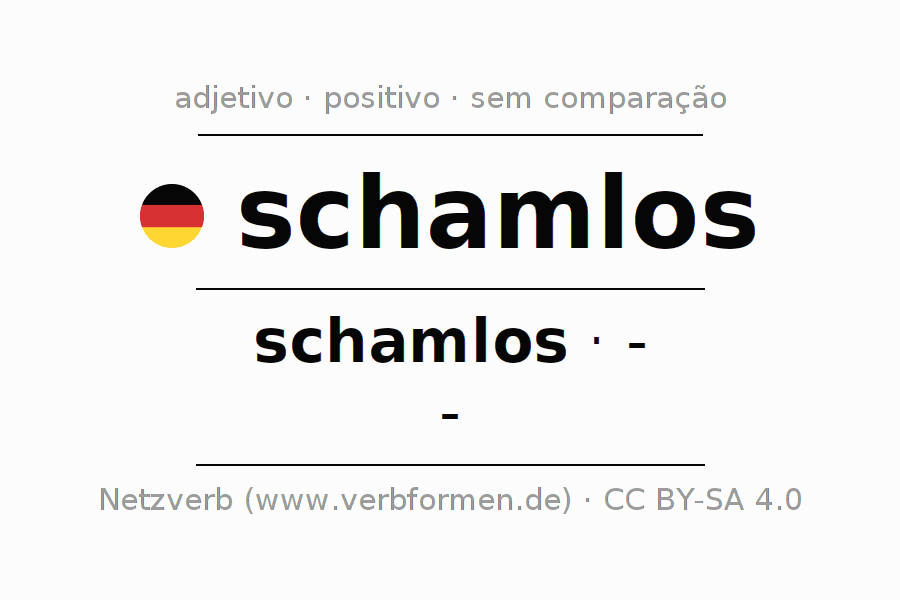 A declinação do adjetivo schamlos não forma o grau de comparação schamlos. O adjectivo não tem forma no comparativo e nem no superlativo. O adjectivo schamlos pode ser utilizado tanto como atributivo antes de um substantivo ou como predicativo junto com um verbo.Não se pode flexionar e comparar somente o adjetivo schamlos, mas sim todos os adjetivos em alemão. Comentários ☆