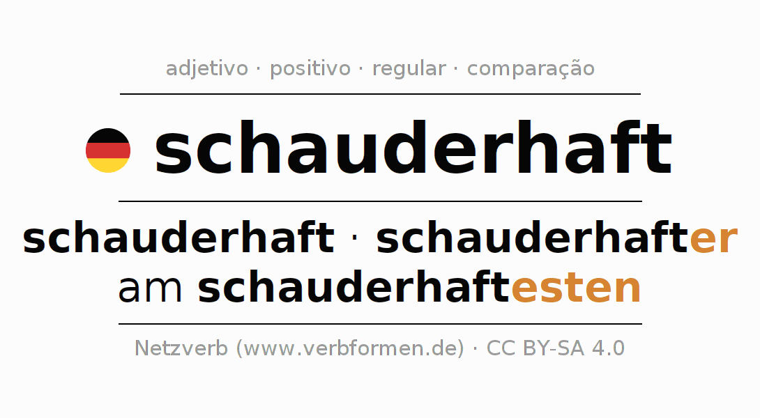 A declinação do adjetivo schauderhaft (horrível, assustador) utiliza as seguintes formas de comparação schauderhaft,schauderhafter,am schauderhaftesten. As terminações para o comparativo e o superlativo são er/esten. O adjectivo schauderhaft pode ser utilizado tanto como atributivo antes de um substantivo ou como predicativo junto com um verbo.Não se pode flexionar e comparar somente o adjetivo schauderhaft, mas sim todos os adjetivos em alemão. Comentários ☆