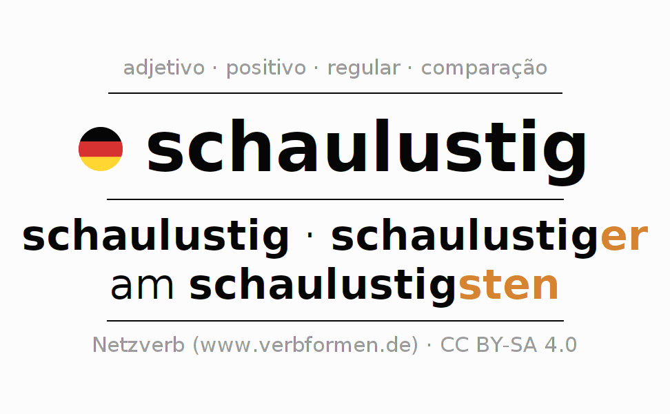 A declinação do adjetivo schaulustig (curioso) utiliza as seguintes formas de comparação schaulustig,schaulustiger,am schaulustigsten. As terminações para o comparativo e o superlativo são er/sten. O adjectivo schaulustig pode ser utilizado tanto como atributivo antes de um substantivo ou como predicativo junto com um verbo.Não se pode flexionar e comparar somente o adjetivo schaulustig, mas sim todos os adjetivos em alemão. Comentários ☆