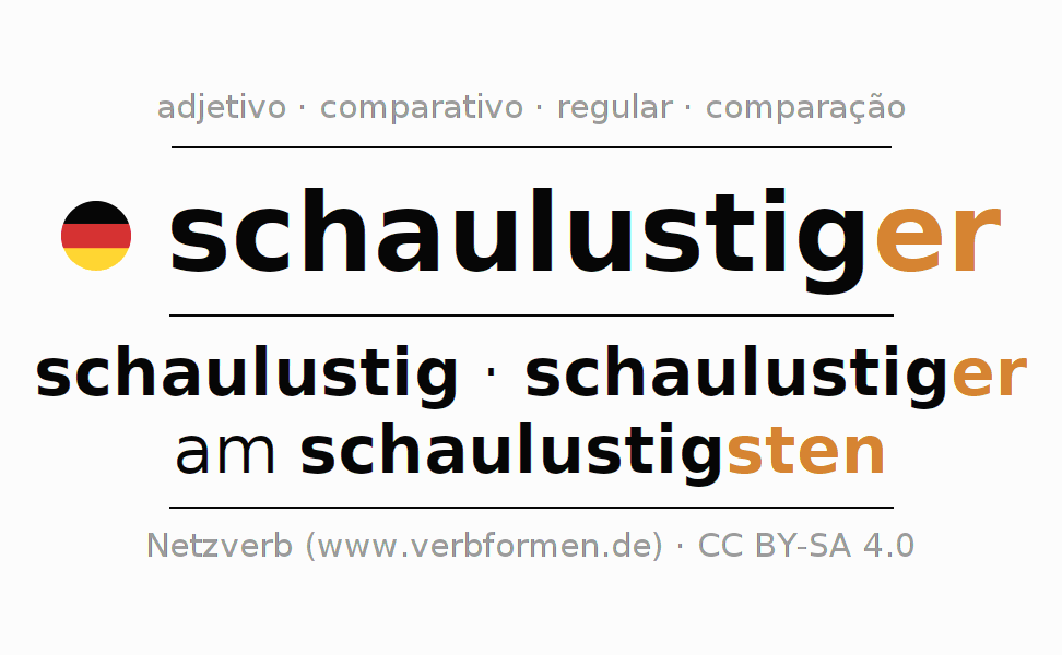 A declinação do adjetivo schaulustiger (curioso) utiliza as seguintes formas de comparação schaulustig,schaulustiger,am schaulustigsten. As terminações para o comparativo e o superlativo são er/sten. O adjectivo schaulustiger pode ser utilizado tanto como atributivo antes de um substantivo ou como predicativo junto com um verbo.Não se pode flexionar e comparar somente o adjetivo schaulustiger, mas sim todos os adjetivos em alemão. Comentários ☆