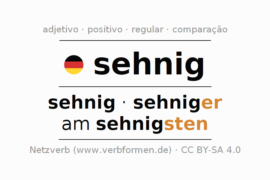 A declinação do adjetivo sehnig (ansiado, desejoso) utiliza as seguintes formas de comparação sehnig,sehniger,am sehnigsten. As terminações para o comparativo e o superlativo são er/sten. O adjectivo sehnig pode ser utilizado tanto como atributivo antes de um substantivo ou como predicativo junto com um verbo.Não se pode flexionar e comparar somente o adjetivo sehnig, mas sim todos os adjetivos em alemão. Comentários ☆