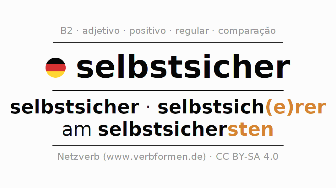 A declinação do adjetivo selbstsicher (autoconfiante, seguro de si) utiliza as seguintes formas de comparação selbstsicher,selbstsicherer,am selbstsichersten. As terminações para o comparativo e o superlativo são er/sten. O adjectivo selbstsicher pode ser utilizado tanto como atributivo antes de um substantivo ou como predicativo junto com um verbo.Não se pode flexionar e comparar somente o adjetivo selbstsicher, mas sim todos os adjetivos em alemão. Comentários ☆