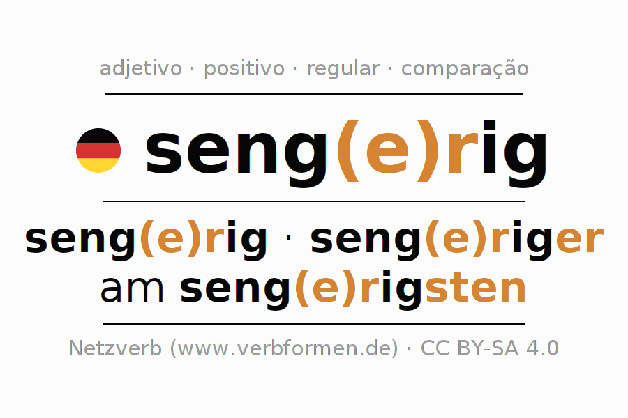 A declinação do adjetivo sengerig utiliza as seguintes formas de comparação sengerig,sengeriger,am sengerigsten. As terminações para o comparativo e o superlativo são er/sten. O adjectivo sengerig pode ser utilizado tanto como atributivo antes de um substantivo ou como predicativo junto com um verbo.Não se pode flexionar e comparar somente o adjetivo sengerig, mas sim todos os adjetivos em alemão. Comentários ☆