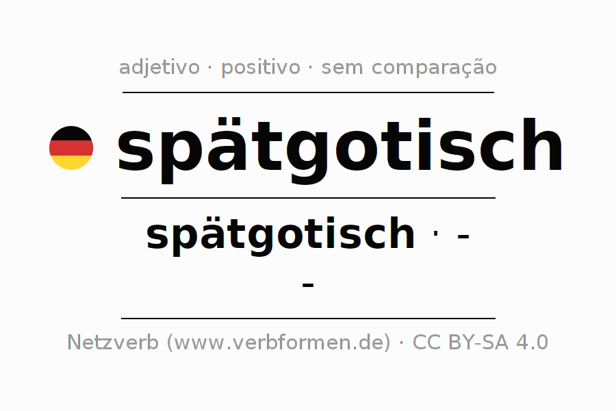 A declinação do adjetivo spätgotisch não forma o grau de comparação spätgotisch. O adjectivo não tem forma no comparativo e nem no superlativo. O adjectivo spätgotisch pode ser utilizado tanto como atributivo antes de um substantivo ou como predicativo junto com um verbo.Não se pode flexionar e comparar somente o adjetivo spätgotisch, mas sim todos os adjetivos em alemão. Comentários ☆