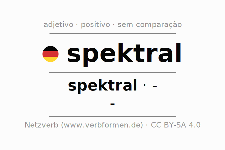 A declinação do adjetivo spektral não forma o grau de comparação spektral. O adjectivo não tem forma no comparativo e nem no superlativo. O adjectivo spektral pode ser utilizado tanto como atributivo antes de um substantivo ou como predicativo junto com um verbo.Não se pode flexionar e comparar somente o adjetivo spektral, mas sim todos os adjetivos em alemão. Comentários ☆