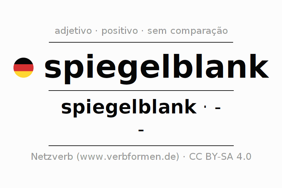 A declinação do adjetivo spiegelblank não forma o grau de comparação spiegelblank. O adjectivo não tem forma no comparativo e nem no superlativo. O adjectivo spiegelblank pode ser utilizado tanto como atributivo antes de um substantivo ou como predicativo junto com um verbo.Não se pode flexionar e comparar somente o adjetivo spiegelblank, mas sim todos os adjetivos em alemão. Comentários ☆