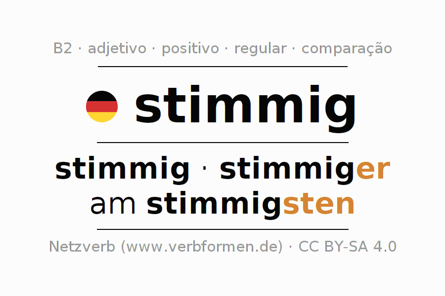 A declinação do adjetivo stimmig (adequado, harmonioso) utiliza as seguintes formas de comparação stimmig,stimmiger,am stimmigsten. As terminações para o comparativo e o superlativo são er/sten. O adjectivo stimmig pode ser utilizado tanto como atributivo antes de um substantivo ou como predicativo junto com um verbo.Não se pode flexionar e comparar somente o adjetivo stimmig, mas sim todos os adjetivos em alemão. Comentários ☆