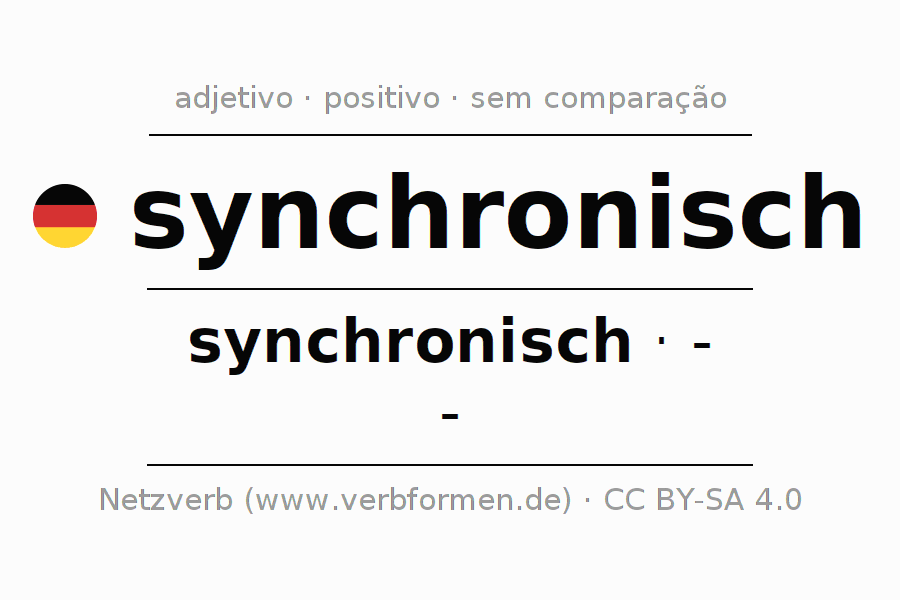 A declinação do adjetivo synchronisch não forma o grau de comparação synchronisch. O adjectivo não tem forma no comparativo e nem no superlativo. O adjectivo synchronisch pode ser utilizado tanto como atributivo antes de um substantivo ou como predicativo junto com um verbo.Não se pode flexionar e comparar somente o adjetivo synchronisch, mas sim todos os adjetivos em alemão. Comentários ☆