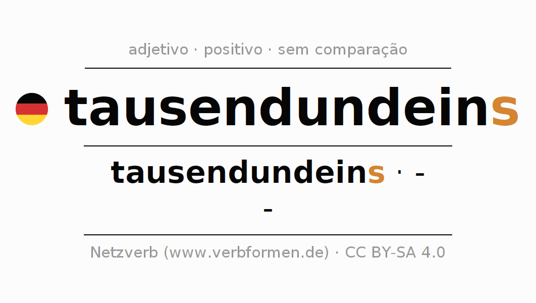 A declinação do adjetivo tausendundeins não forma o grau de comparação tausendundeins. O adjectivo não tem forma no comparativo e nem no superlativo. O adjectivo tausendundeins pode ser utilizado tanto como atributivo antes de um substantivo ou como predicativo junto com um verbo.Não se pode flexionar e comparar somente o adjetivo tausendundeins, mas sim todos os adjetivos em alemão. Comentários ☆