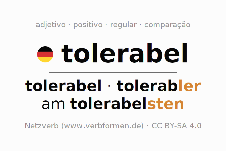 A declinação do adjetivo tolerabel (aceitável, suportável) utiliza as seguintes formas de comparação tolerabel,tolerabler,am tolerabelsten. As terminações para o comparativo e o superlativo são er/sten. O adjectivo tolerabel pode ser utilizado tanto como atributivo antes de um substantivo ou como predicativo junto com um verbo.Não se pode flexionar e comparar somente o adjetivo tolerabel, mas sim todos os adjetivos em alemão. Comentários ☆