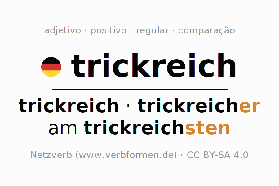 A declinação do adjetivo trickreich (astuto, ingenioso) utiliza as seguintes formas de comparação trickreich,trickreicher,am trickreichsten. As terminações para o comparativo e o superlativo são er/sten. O adjectivo trickreich pode ser utilizado tanto como atributivo antes de um substantivo ou como predicativo junto com um verbo.Não se pode flexionar e comparar somente o adjetivo trickreich, mas sim todos os adjetivos em alemão. Comentários ☆