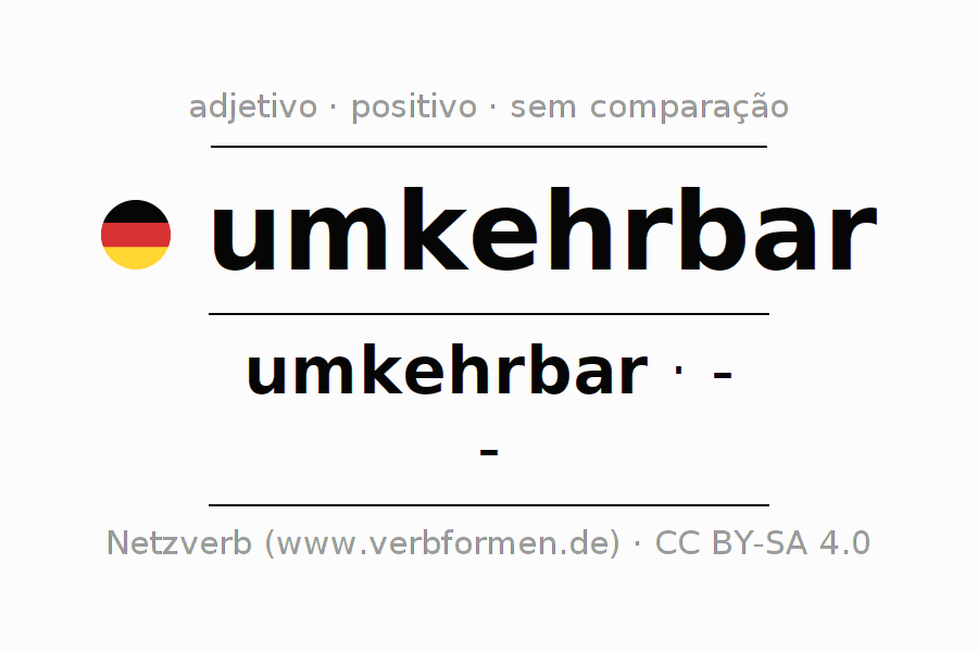 A declinação do adjetivo umkehrbar não forma o grau de comparação umkehrbar. O adjectivo não tem forma no comparativo e nem no superlativo. O adjectivo umkehrbar pode ser utilizado tanto como atributivo antes de um substantivo ou como predicativo junto com um verbo.Não se pode flexionar e comparar somente o adjetivo umkehrbar, mas sim todos os adjetivos em alemão. Comentários ☆