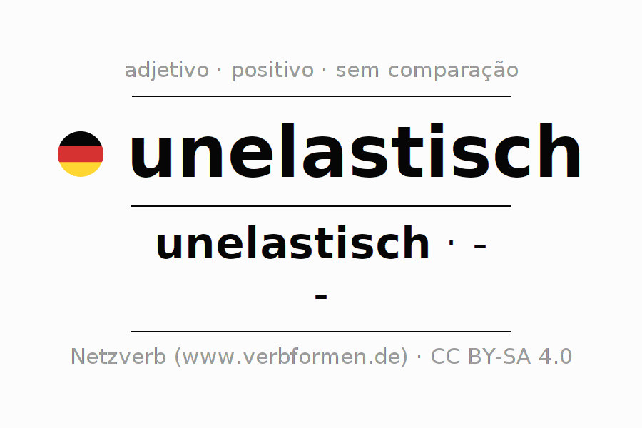 A declinação do adjetivo unelastisch não forma o grau de comparação unelastisch. O adjectivo não tem forma no comparativo e nem no superlativo. O adjectivo unelastisch pode ser utilizado tanto como atributivo antes de um substantivo ou como predicativo junto com um verbo.Não se pode flexionar e comparar somente o adjetivo unelastisch, mas sim todos os adjetivos em alemão. Comentários ☆