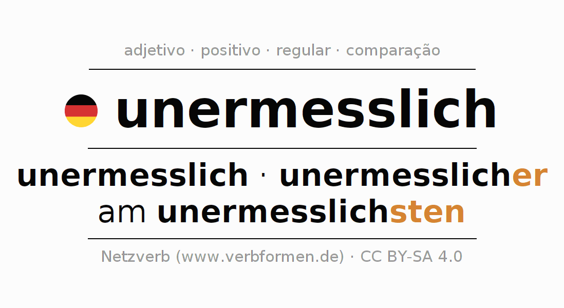 A declinação do adjetivo unermesslich (imensurável, infinito) utiliza as seguintes formas de comparação unermesslich,unermesslicher,am unermesslichsten. As terminações para o comparativo e o superlativo são er/sten. O adjectivo unermesslich pode ser utilizado tanto como atributivo antes de um substantivo ou como predicativo junto com um verbo.Não se pode flexionar e comparar somente o adjetivo unermesslich, mas sim todos os adjetivos em alemão. Comentários ☆