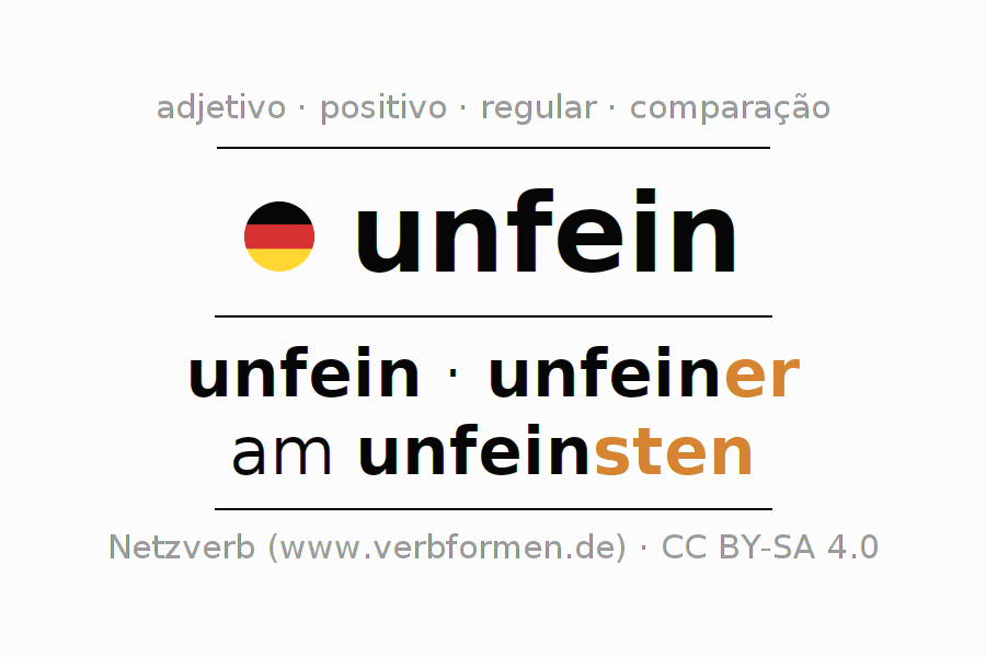 A declinação do adjetivo unfein (grosseiro, não refinado) utiliza as seguintes formas de comparação unfein,unfeiner,am unfeinsten. As terminações para o comparativo e o superlativo são er/sten. O adjectivo unfein pode ser utilizado tanto como atributivo antes de um substantivo ou como predicativo junto com um verbo.Não se pode flexionar e comparar somente o adjetivo unfein, mas sim todos os adjetivos em alemão. Comentários ☆