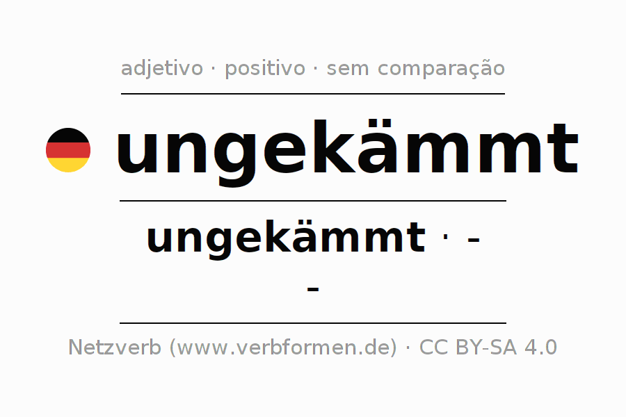 A declinação do adjetivo ungekämmt não forma o grau de comparação ungekämmt. O adjectivo não tem forma no comparativo e nem no superlativo. O adjectivo ungekämmt pode ser utilizado tanto como atributivo antes de um substantivo ou como predicativo junto com um verbo.Não se pode flexionar e comparar somente o adjetivo ungekämmt, mas sim todos os adjetivos em alemão. Comentários ☆