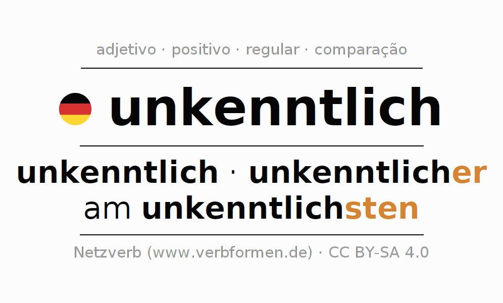 A declinação e o comparativo de unkenntlich são apresentados online em tabelas em todas as formas: forte, fraca e mista. Assim como no singular e no plural. Também são apresentados os 4 casos: nominativo (auch 1. Fall, Wer-Fall), genitivo (auch 2. Fall, Wes-Fall, Wessen-Fall), dativo (auch3. Fall, Wem-Fall) e acusativo (auch4. Fall, Wen-Fall). Mais informações podem ser encontradas em Wiktionary unkenntlich e unkenntlich no Duden.